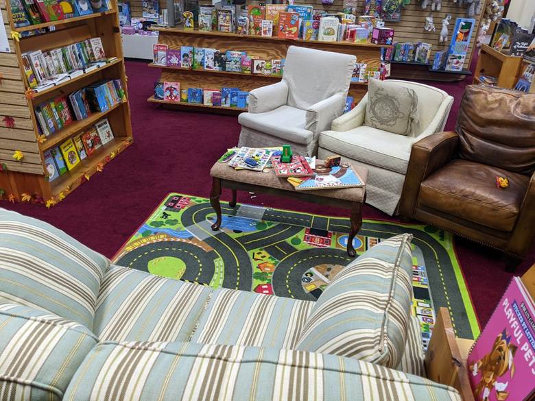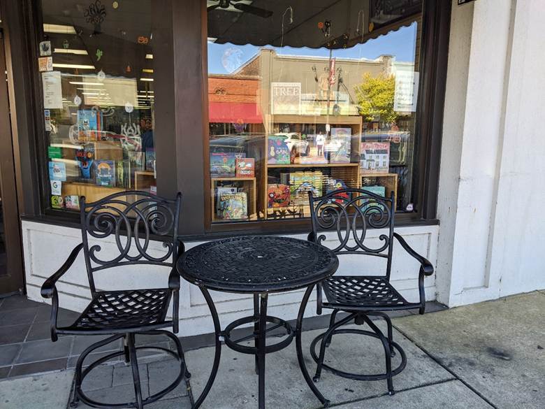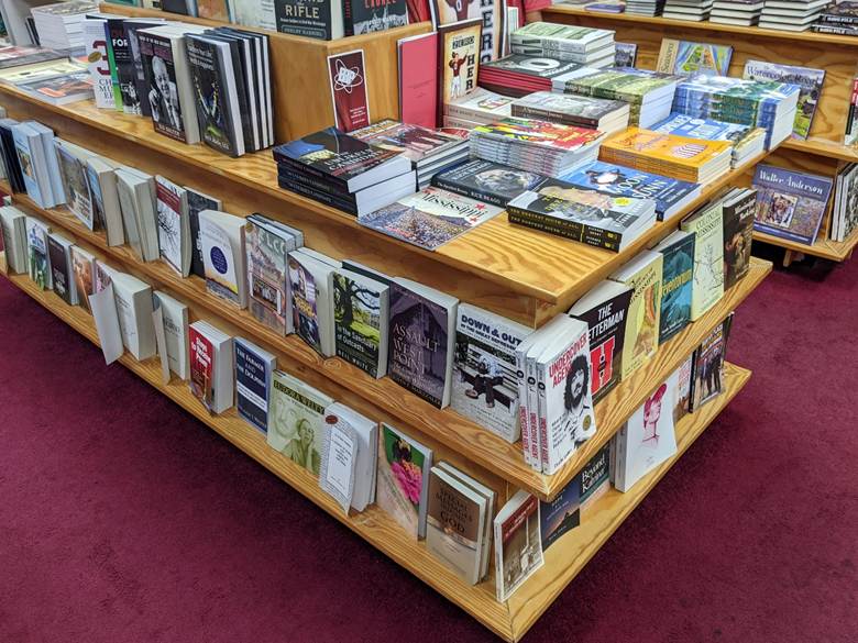 Next stop: the South, to a local favorite of this writer, the humbly named Book Mart of Mississippi’s college town, Starkville, MS. The store owner is a friendly middle-aged woman, the first floor is new books, complete with a nice sitting area near the children’s literature, MSU memorabilia and apparel, and a small coffee bar/café in back. On the upper floor you’ll find used books, and soft chairs. The small town feel still reigns in this place. Here is a view from the street, University Drive: