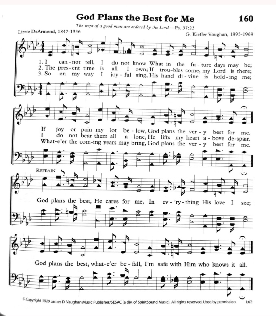 Chorus: God plans the best, He cares for me, In everything His love I see; God plans the best, whate’er befall, I’m safe with Him who knows it all.